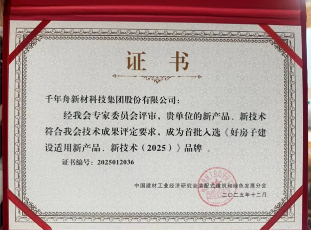 2025年12月12日,第十二届“宜居中国”装配式内装修产业发展大会,暨中国建材工业经济研究会装配式建筑和绿色发展分会年会于北京召开,千年舟受邀参会,凭借硬核的技术实力,成功入选首批《好房子建设适用新产品、新技术(2025)》品牌,斩获权威认证!